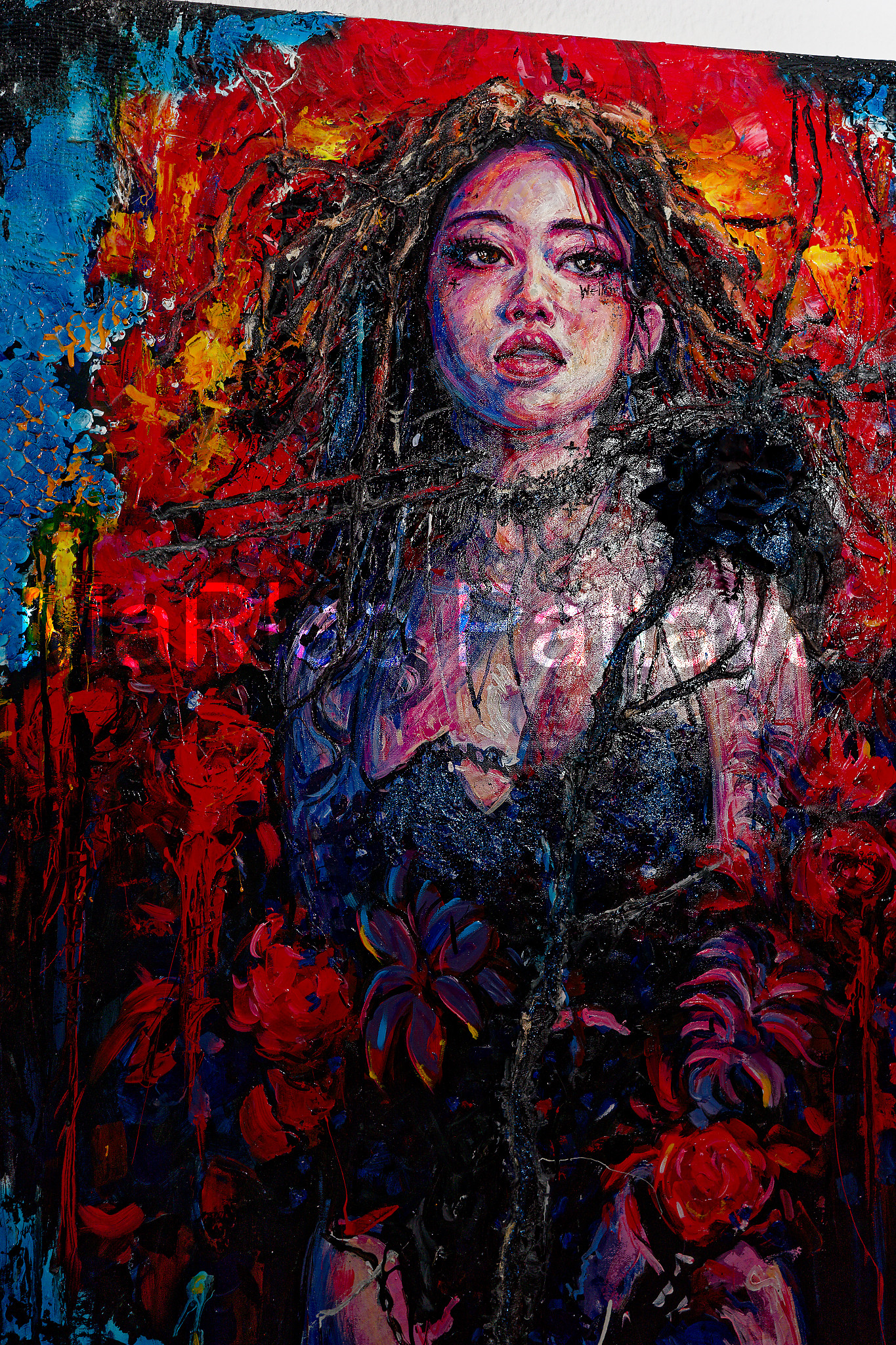 Das Werk zeigt eine geheimnisvolle weibliche Figur vor einem expressiven, vielschichtigen Farbgrund. Leidenschaftliches Rot, tiefes Blau und dunkle Akzente verschmelzen zu einer spannungsvollen Komposition. Die eingearbeiteten Plastikblume sowie textile Elemente verleihen dem Gemälde eine nahezu skulpturale Tiefe und machen es zu einem eindrucksvollen Mixed-Media-Unikat.